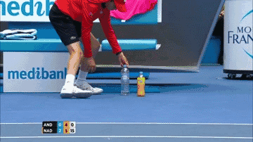 17个大满贯得主纳达尔对水瓶的执念,向来最让媒体津津乐道。在赛场上,纳达尔总是把他的两瓶水(一瓶常温,一瓶冷冻)放在椅子的左边,瓶子的标签必须面向他即将使用的那一侧场地;每次喝水时,他总是两瓶水各喝一点,并且不允许任何人动他的水瓶,像中国的五行八卦阵一样神秘。还有人开玩笑说,想赢纳达尔,得先踢翻他的水瓶。